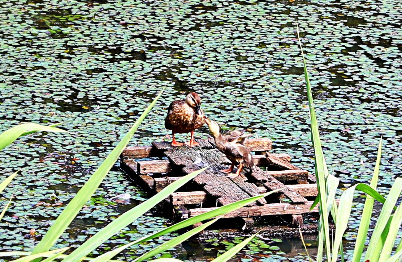 조류관찰대안 흰빰검둥오리 가족 엄마와 새끼오리 새끼오리가 날개에 묻은 물을 털고있다.