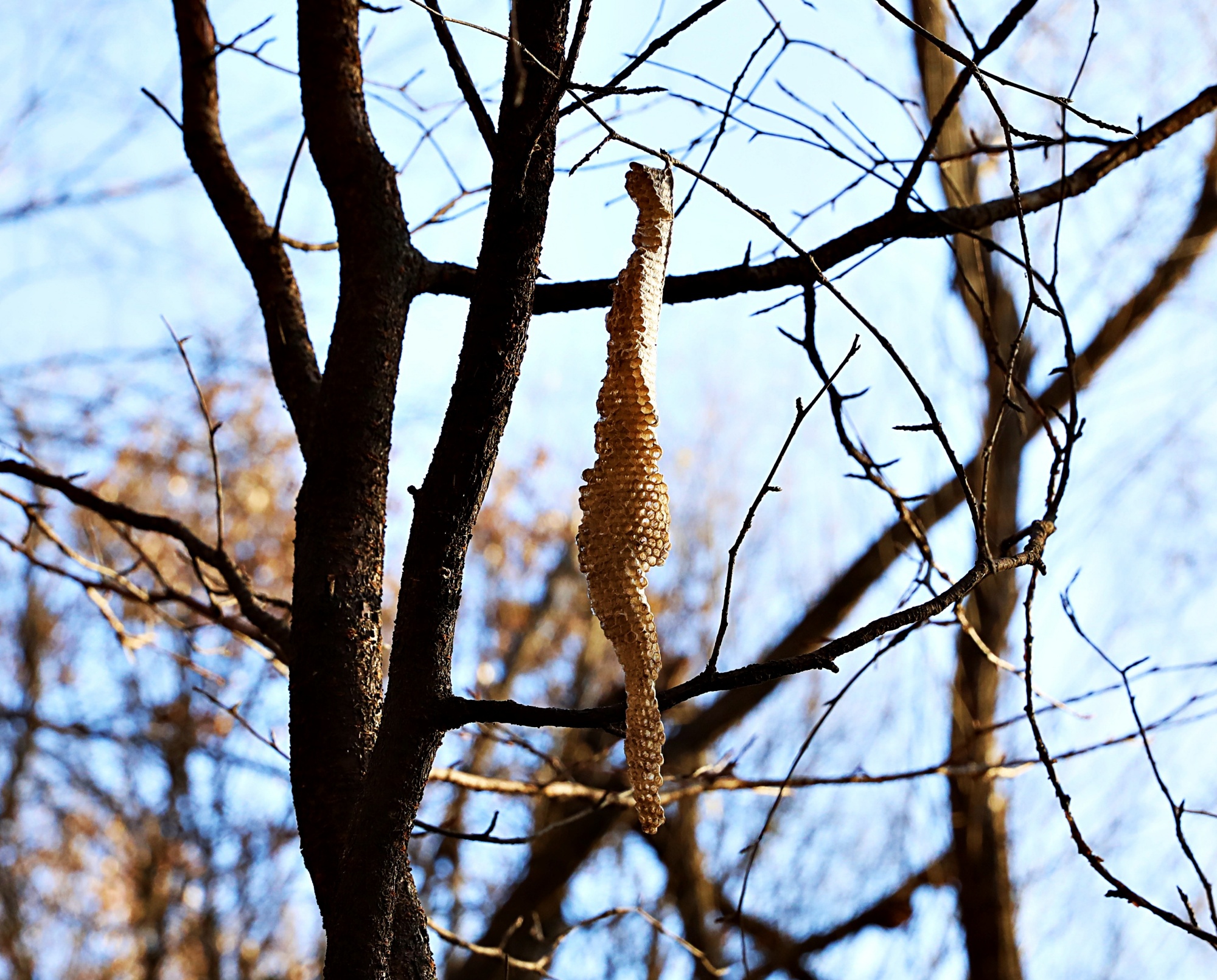 생태숲 나무에 길게 드리워진 벌집 빈 껍데기만 바람에 펄럭인다.