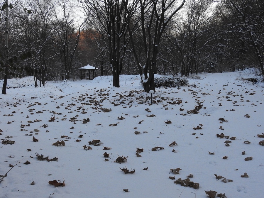 12월 5일 어제 저녁에 첫눈이 내린 후 금요일 아침 눈위에 낙엽이 가는 가을을 아쉬워 하는 듯 합니다.