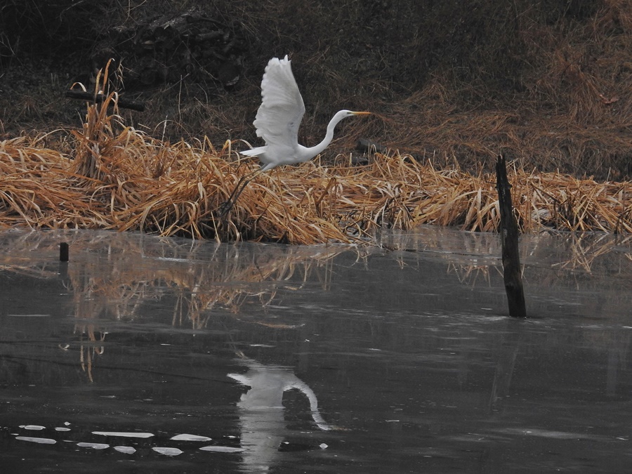 12월11일 겨울비가 내린 오전 조류관찰대 호수에서 중대백로가 날아 가는 모습이 반영과 함께 잘 어울리네요.