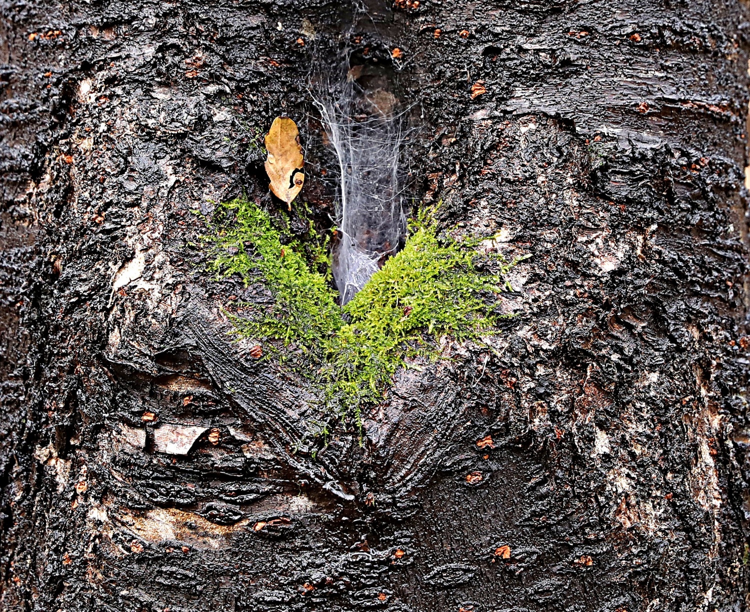 생태숲 나무 오목한 부분 겨울을 나기 위한 거미줄 비를 머금은 이끼가 새파랗다