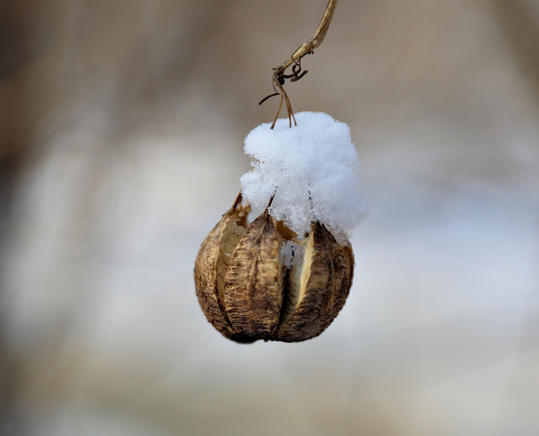 생태숲 바람에 흔들리던 주방울덩굴 오늘은 눈을 머리에 이고 있다