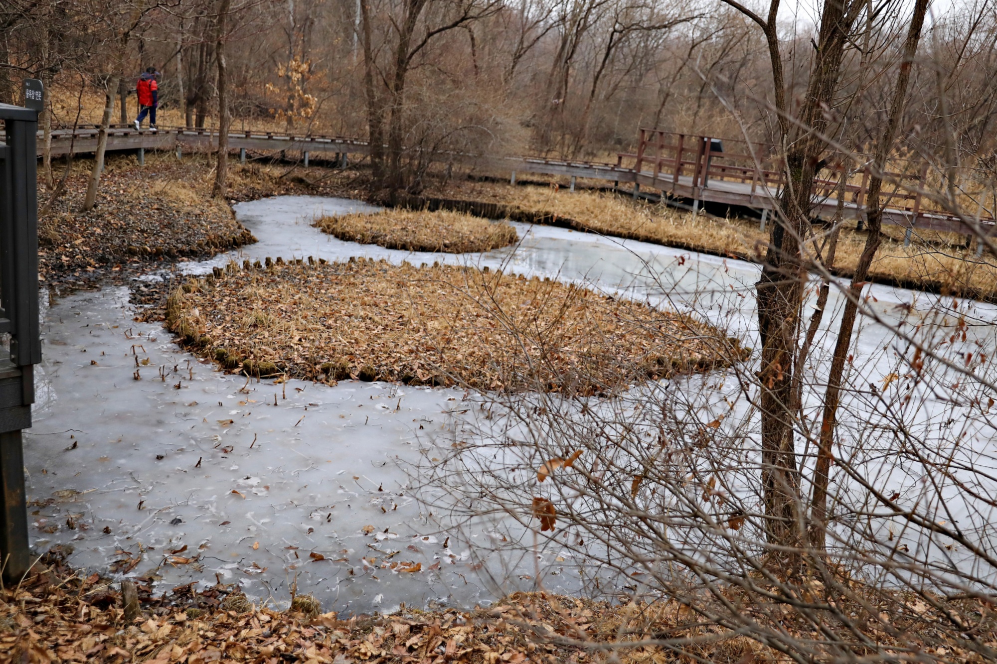 물옥잠연못 얼음 하트 그옆을 걷는 시민