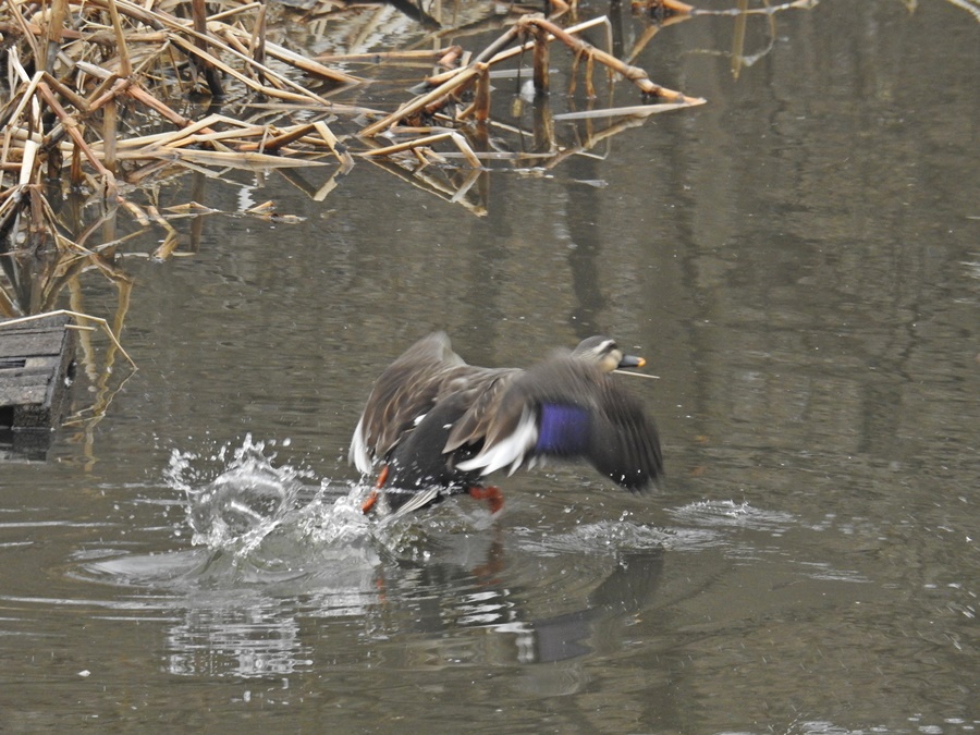 봄날 오후 길동생태공원 연못에서 흰뺨검둥오리가 물을 가르며 날아 가네요.