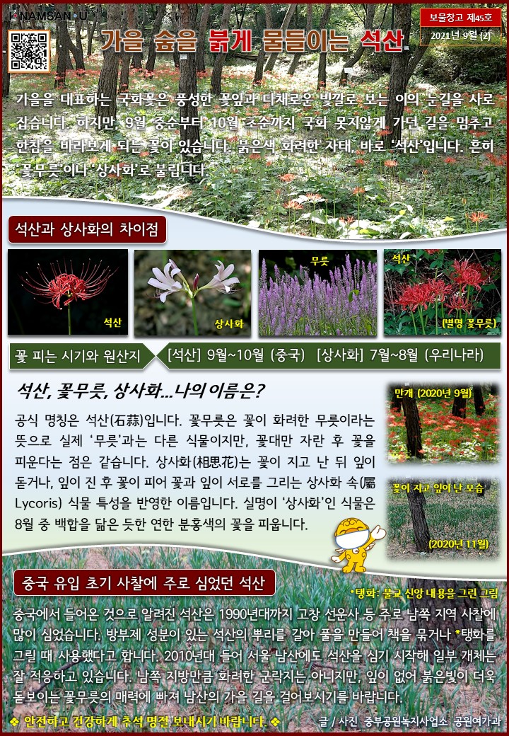 잎이 없어 붉은빛이 더욱 돋보이는 꽃무릇의 매력에 빠져 남산의 가을 길을 걸어보시기를 바랍니다.