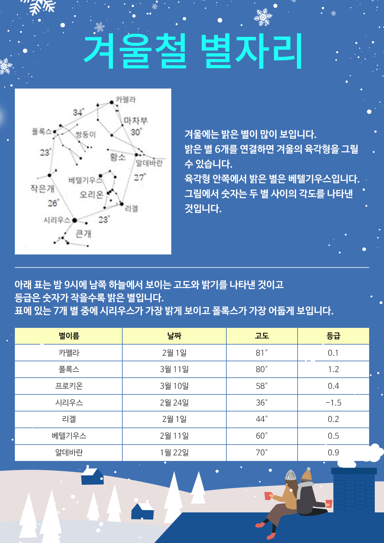 아래 표는 밤 9시에 남쪽 하늘에서 보이는 고도와 밝기를 나타낸 것이고 등급은 숫자가 작을수록 밝은 별입니다.