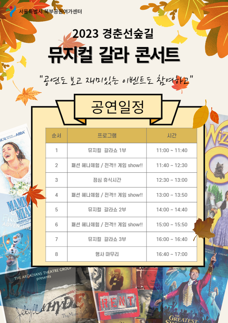 산책하기 좋은 철길공원 경춘선숲길에서 감동의 뮤지컬 명곡과 명장면 무대가 펼쳐집니다.