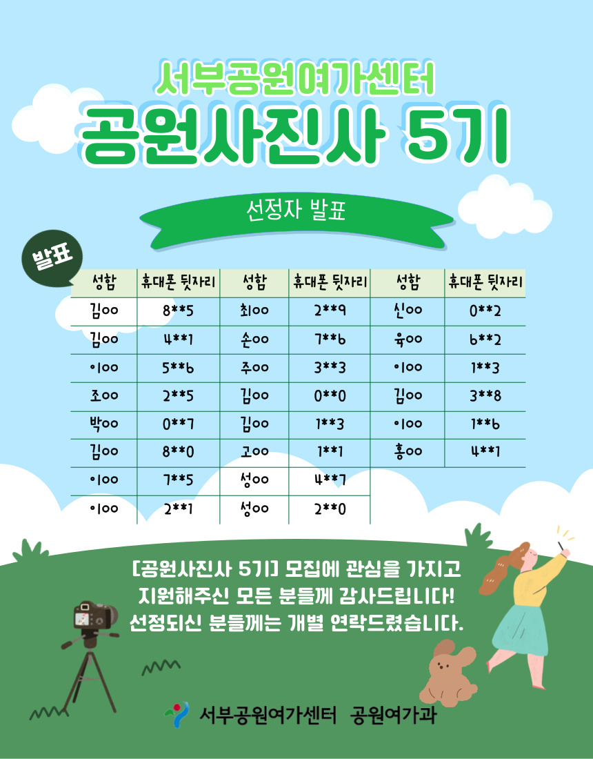 서부공원여가센터에 관심을 가지고 「공원사진사 5기」 모집에 지원해주신 모든 분들께 진심으로 감사드립니다. 서류 심사를 통해 최종 선정된 공원사진사 5기 명단을 아래와 같이 안내드립니다.